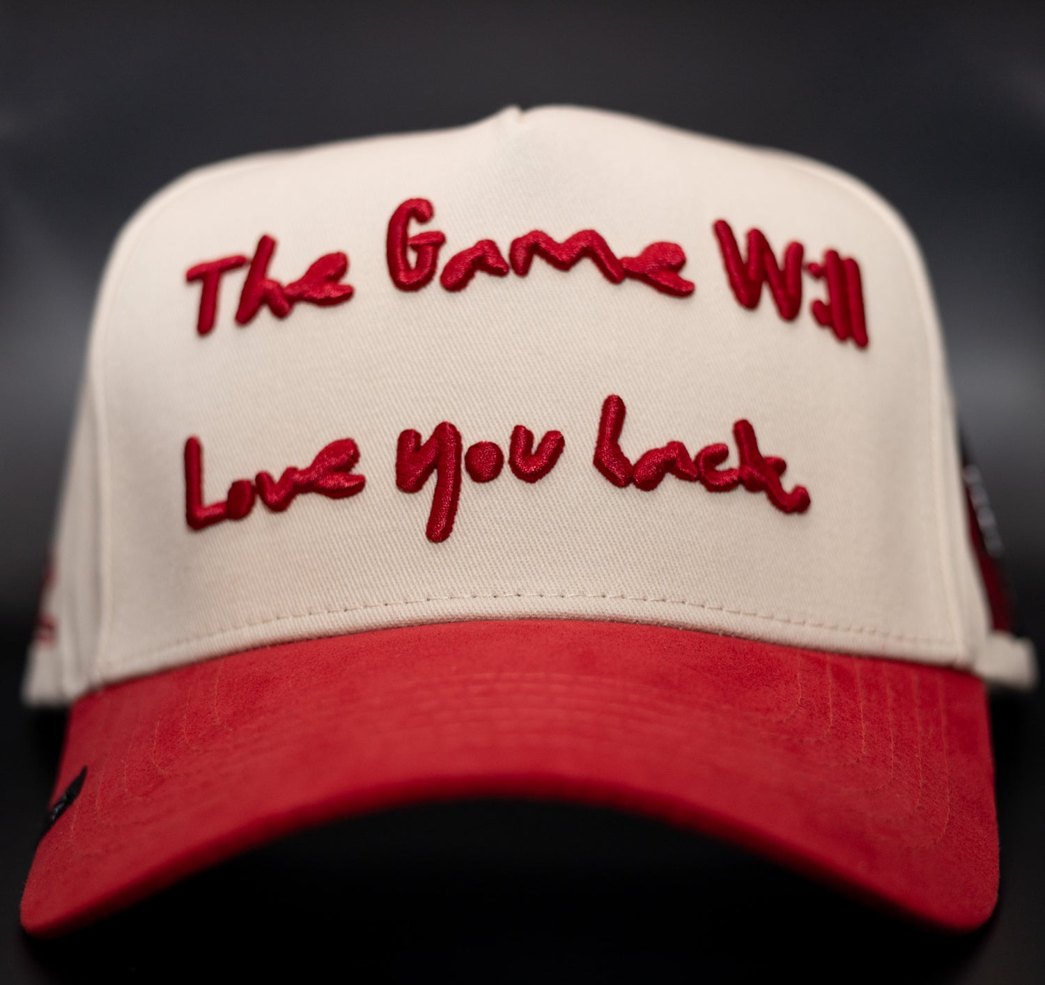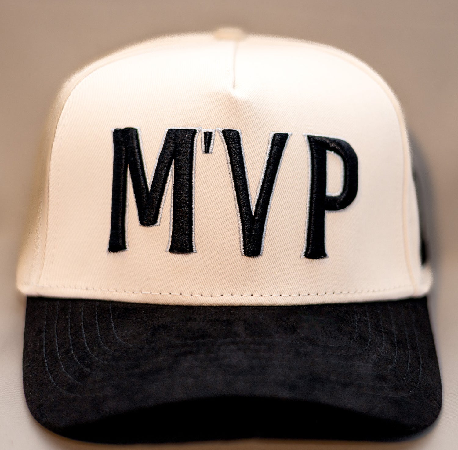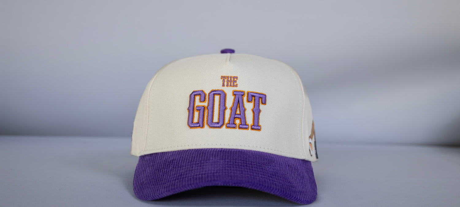 CREAM WITH A PURPLE CORDUROY BRIM.